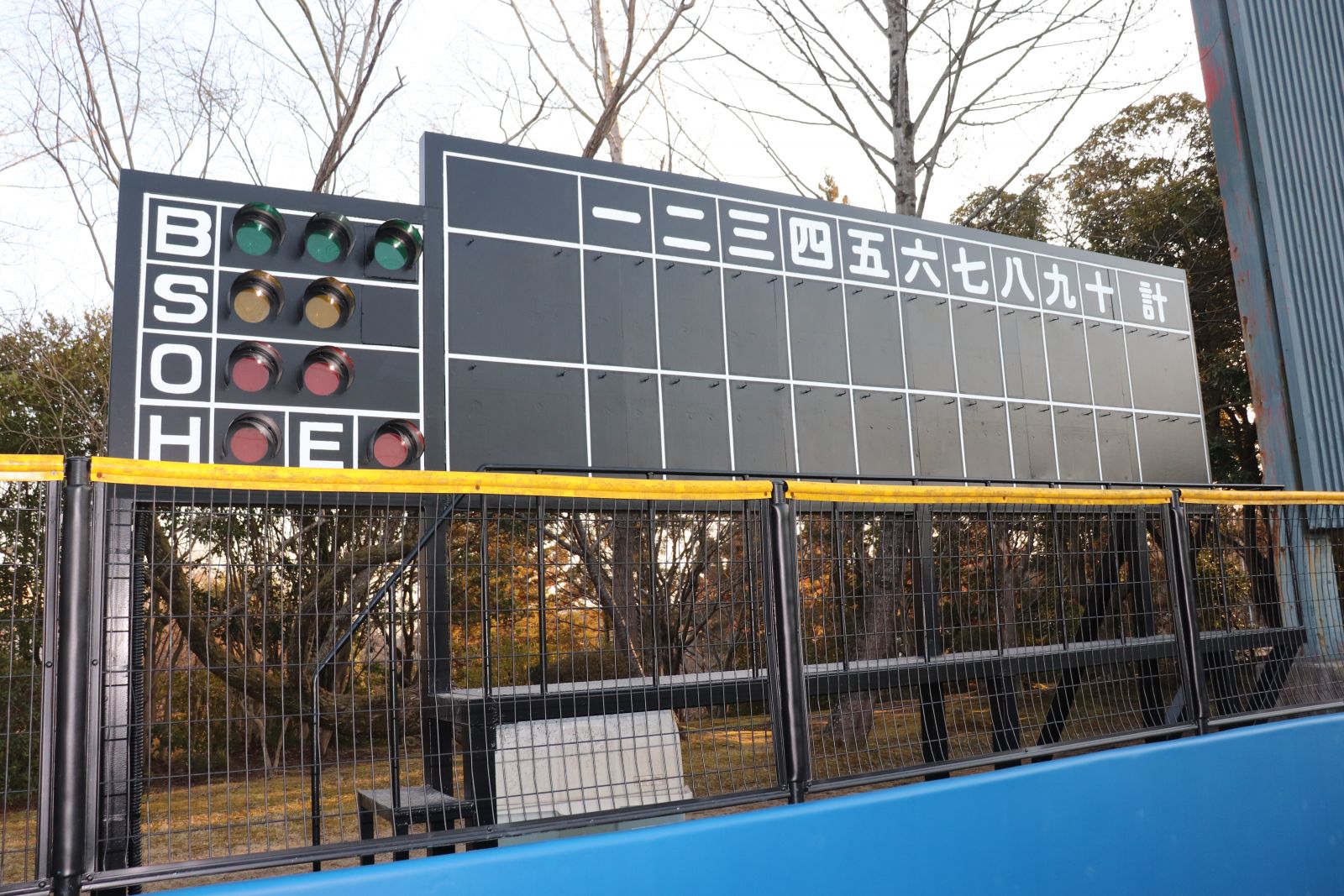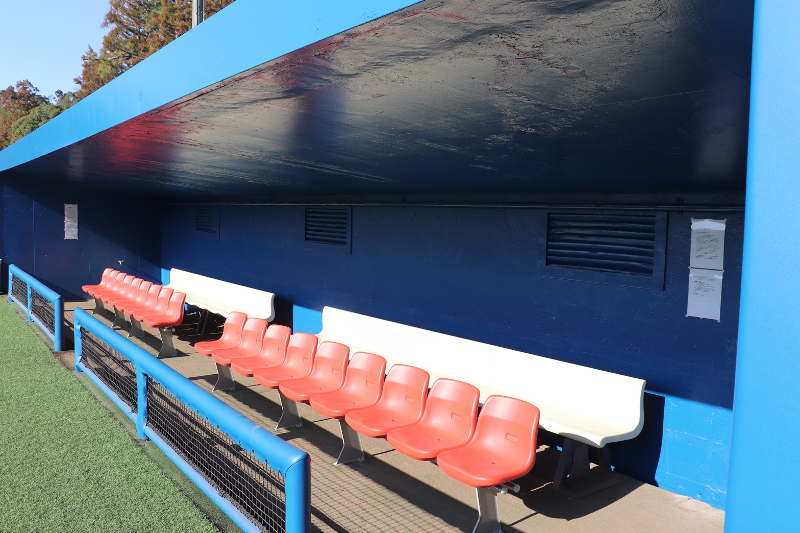 本部席やベンチ、スコアボードが塗装されました。